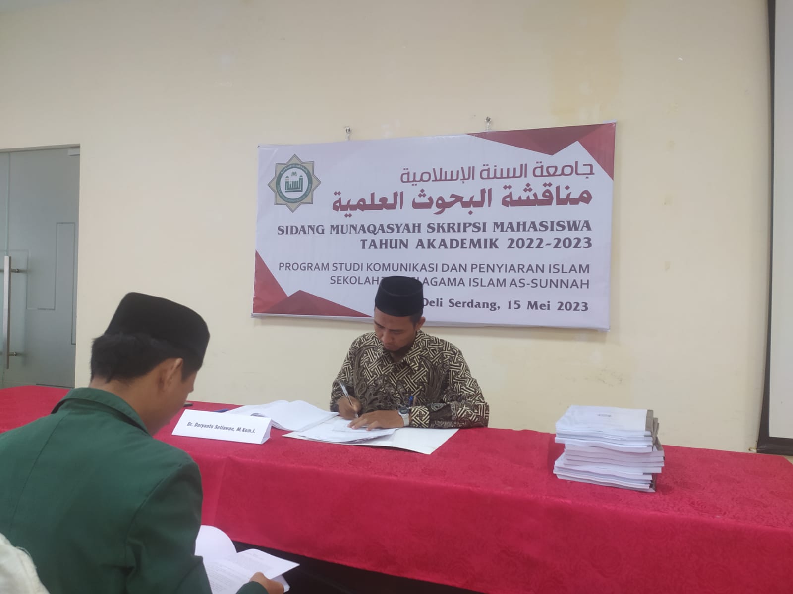 Deli Serdang, 15 Mei 2023 - Sebanyak 20 orang mahasiswa Program Studi Komunikasi dan Penyiaran Islam STAI As-Sunnah Deli Serdang berhasil menyelesaikan ujian sidang munaqasyah skripsi mereka. Ujian ini dilaksanakan di Gedung Yayasan Arrisalah.